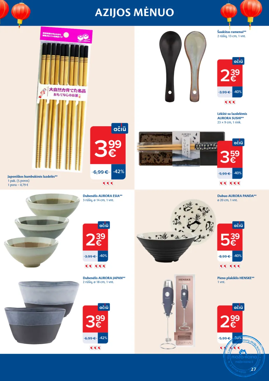 - Gaminimo atributika: Kataloge dažnai siūlomi ne tik maisto produktai, bet ir specialūs įrankiai – WOK keptuvės, bambukiniai garintuvai, valgymo lazdelės bei sušių sukimo kilimėliai už itin patrauklią kainą.