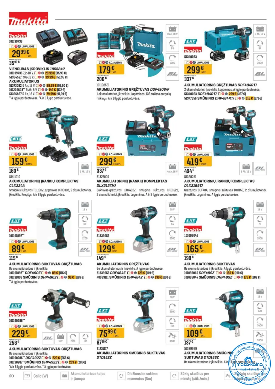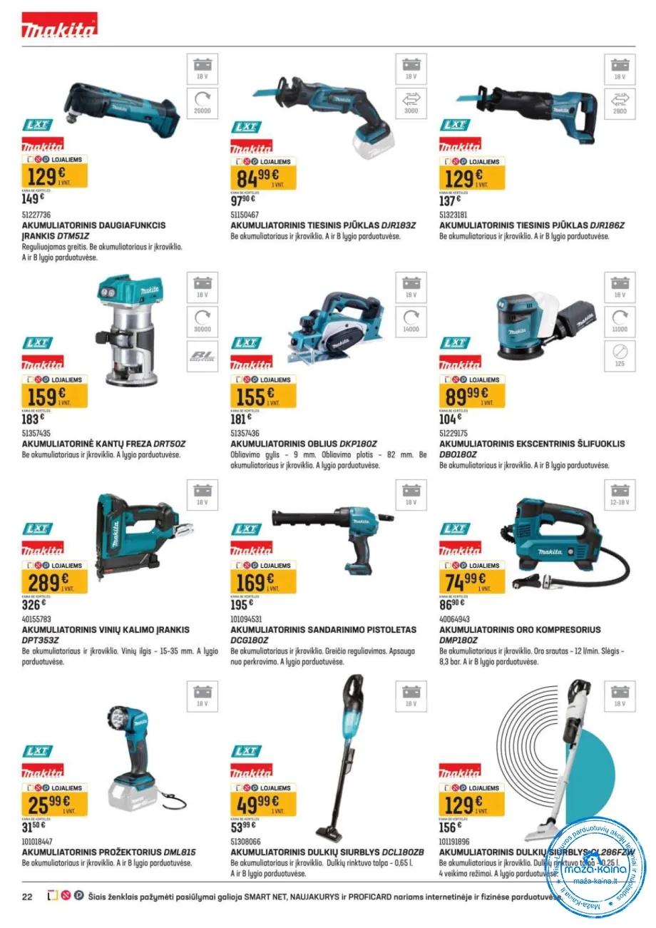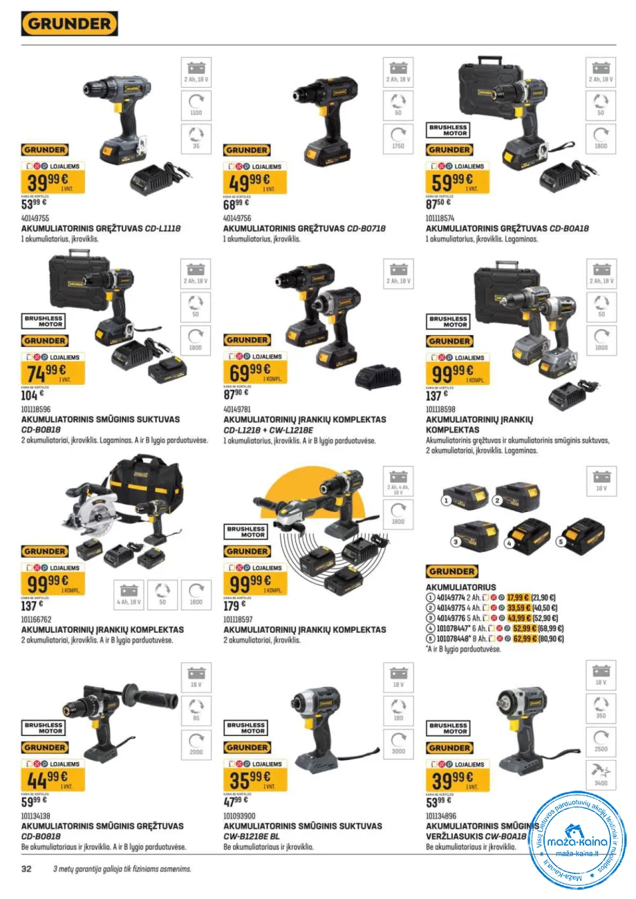 - Elektriniai ir akumuliatoriniai įrankiai: Pasaulyje pripažintų gamintojų (tokių kaip Makita, Bosch, DeWalt, Ryobi) gręžtuvai, perforatoriai, šlifuokliai ir diskiniai pjūklai, užtikrinantys maksimalią galią ir darbo našumą.