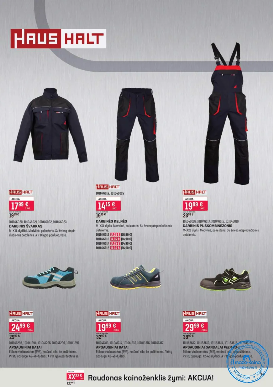 - Darbo sauga ir apranga: Patogūs darbo rūbai, apsauginiai akiniai, tvirtos pirštinės bei profesionali avalynė, garantuojanti jūsų saugumą net ir sudėtingiausių darbų metu.